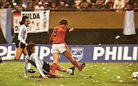 Dans le groupe A, lors du second tour, les deux équipes qui peuvent se qualifier pour la finale sont opposées l'une contre l'autre à l'occasion du dernier match décisif. Pays-Bas-Italie. Les Italiens doivent absolument s'imposer alors que la sélection orange - qui joue en blanc pour l'occasion - peut se contenter du match nul. Mais tintin les calculs d'apothicaire. L'Italie démarre fort et ouvre le score dès la 16ème minute par un auto-goal de Brandts (qui lave plus blanc avec une bonne lessive, ce qui explique la couleur des maillots hollandais pour ce match). A la mi-temps, la Squadra Azzura est qualifiée, donc ça va bétonner derrière. C'est sûr. Mais les Hollandais qui ont de la répartie et aiment bien se salir, traînent les Italiens dans la boue en seconde période. Tout d'abord, Brandts, qui aime bien faire parler de lui (bonjour la pub !) remet les pendules à l'heure 5 minutes après le début du deuxième acte. A un quart d'heure de la fin, Haan envoie un missile des 40 mètres dans les cages de Zoff qui est battu. 2-1 pour les Hollandais. L'Italie essuie sa première défaite du mondial qui lui est fatale, les Pays-Bas, quatre ans après le WM 74, atteint de nouveau la finale de la coupe du monde.
