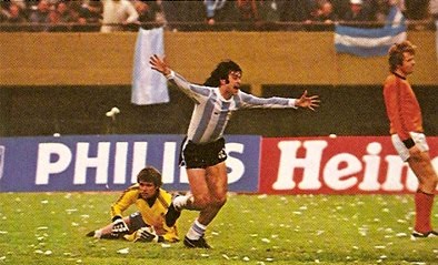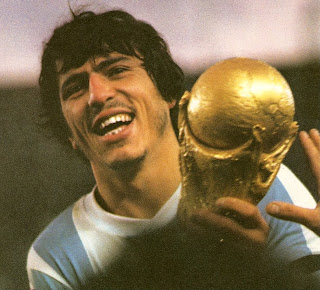 Il est beau, grand et fort, il a du poil sous les bras et porte parfois la moustache (pas ce qu'il a fait de mieux dans sa vie mais bref). Mario Alberto Kempes, deux années de suite meilleur buteur de la Liga (1977 et 1978), arrive à la coupe du monde dans son pays en étant un peu contesté malgré ses titres de pichichi (pas dans sa caisse mais celles des gardiens adverses). Le gaillard joue en Espagne, au F.C Valencia, depuis quelques années (1974) et les Argentins, ils aiment pas trop ça à l'époque. Kempes est un exilé, le vilain. D'ailleurs, c'est avec le n°10 dans le dos qu'il est sélectionné pour le mondial, et non avec le n°9. Preuve que l'avant-centre argentin doit faire des concessions et se tenir à carreau s'il veut jouer. Son début de coupe du monde est d'ailleurs très timide, il ne score pas lors du premier tour, mais la machine s'emballe à partir du match contre la Pologne. Le bel hidalgo inscrit un doublé et prend dès lors un abonnement pour cette formule. Il réitère contre le Pérou dans un match plus que décisif pour l'Argentine - une qualification en finale en vue - et inscrit encore deux buts lors de cette même finale contre la Hollande, qui en fait le héros du match et de toute une patrie. Le peuple est ainsi, versatile. La coupe du Monde de Kempes se résume donc à 6 buts en trois matchs. Suffisant pour se mettre le public dans la poche et retourner en Espagne avec l'esprit du devoir accompli et glaner encore un ou deux titres chez les Ibères (une coupe du Roi en 1979, une C2 en 1980 et une super coupe d'Europe la même année).