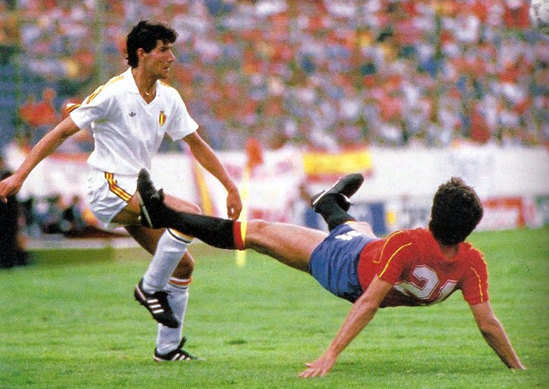 La planche (ou la plancha, mais là on pense tout de suite à la bouffe alors que c'est pas le ton du sujet). En général on fait ça plutôt sur l'eau pour avoir l'air moins con (ça se voit moins en fait) mais Michel, le défenseur du Real Madrid, décide de s'en taper une petite sur la pelouse, pas culotté celui-là et sous nos yeux en plus, croyant faire le malin devant le Belge Enzo Scifo qui, comme tout le monde le sait, danse le tango ! Raté mon pote avec ta planche et en plus t'as l'air benêt comme ça, tiens un vieux lob et j't'enfume mon gars. Du Scifo dans le texte. Sinon pour le geste, Michel est bien parallèle au sol, les pointes tendues vers l'avant. Bon bah ça vaut bien la moyenne quoi !