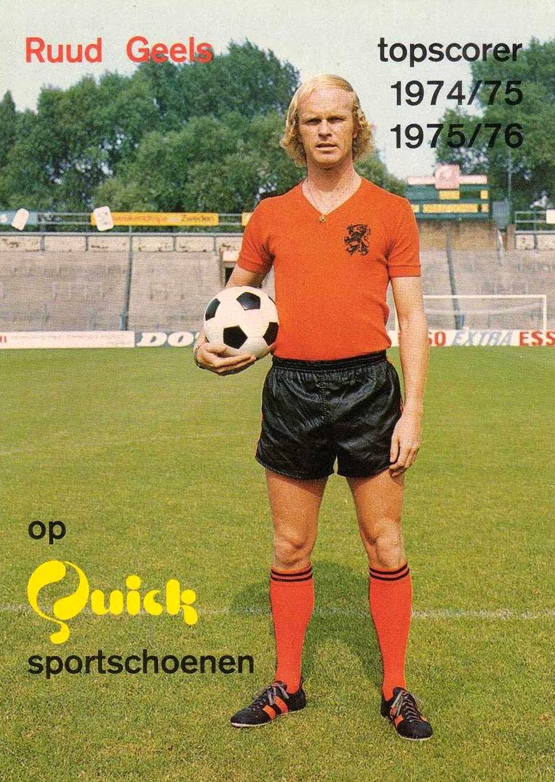 Nom de nom, ça pourrait passer pour une pub qui vante les mérites d'une chaîne de restauration rapide, ou bien un truc de surfeur. Ok, rien à voir mais bon... En tous cas, c'est Ruud Geels qui fait la promotion pour une paire de crampons à deux bandes, parce que trois, c'est déjà pris. C'est nouille mais c'est comme ça. Pas grave, il en jette quand même le buteur néerlandais aux 20 capes (entre 1974 et 1981), passé par tout le Béné en oubliant le Lux, peut-être parce que c'était un bon joueur de terroir humble et fidèle à sa terre qui aimait pas trop le fric. Enfin, il a quand même fait 9 clubs dans sa carrière (notamment Feyenoord Rotterdam, Ajax, Anderlecht ou PSV Eindhoven). Sinon, bah, belles shoes Ruud. Gut. Et putain de short noir aussi... 'tain et la coupe hard-rock. Pis top scorer 1974/75 et 1975/76, ça cause aussi dans le poste. Sacré gaillard...