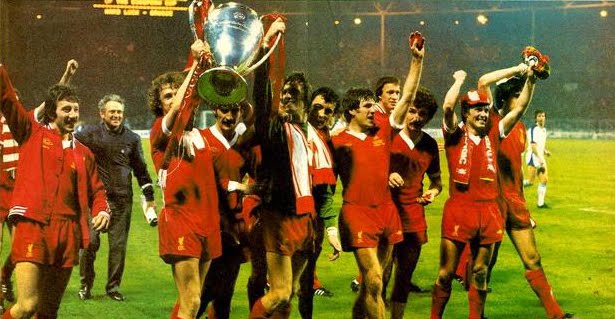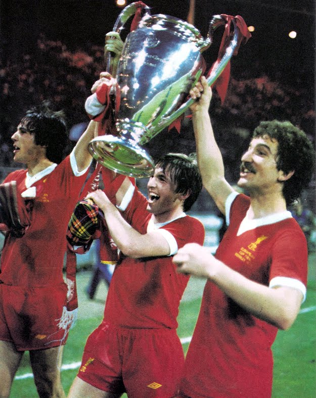 Kenny Dalglish vient de marquer l'unique but de la finale. Ses copains entament une chenille pour fêter ça.