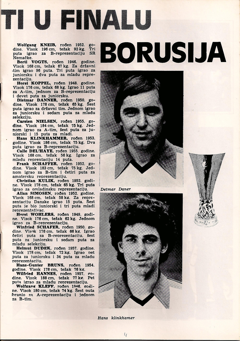 Borussia Mönchengladbach est un habitué des finales européennes. Rendez-vous est pris tous les 2 ans depuis 1973 pour les Allemands qui disputent le titre UEFA à Liverpool et au F.C Twente (1975), puis de nouveau les « Reds » deux ans plus tard en finale de la coupe d'Europe des clubs champions. Deux défaites (face aux joueurs de la Mersey) contre un succès, net et sans bavure devant les Hollandais qu'ils étrillent chez eux lors de la seconde manche (0-0, 1-5), Mönchengladach espère rétablir la balance à la fin de la saison 1979 pour leur quatrième finale en 6 ans. Les hommes d'Udo Lattek partent d'ailleurs favoris avant cette double confrontation. Par expérience à ce niveau de la compétition et au jeu offensif proposé par le club rhénan qui en est déjà à 24 buts inscrits durant son parcours - il élimine successivement Strum Graz (5-1, 2-1), Benfica (0-0, 2-0), Slask Wroclaw (1-1, 4-2), Manchester City (1-1, 3-1) et MSV Duisbourg (2-2, 4-1) - avant d'affronter l'Etoile Rouge de Belgrade. De leur côté, les Yougoslaves cravachent dur pour gagner sa place de finaliste. Presque un hasard de retrouver les Serbes à ce stade de la compétition après ses qualifications à l'arrachée, souvent à la faveur du but marqué à l'extérieur, contre Dynamo Berlin (2-5, 4-1), Sporting Gijon (1-0, 1-1), Arsenal (1-0, 1-1), West Bromwich Albion (1-0, 1-1) et Hertha Berlin (1-0, 1-2).